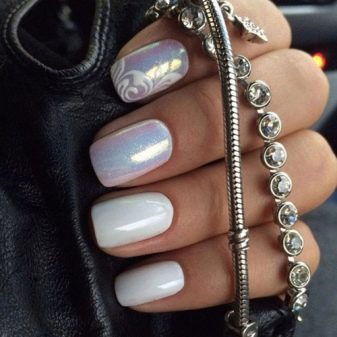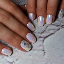 Pearly marigolds are obtained in a combination of white gel polish and special powder. It is most convenient to work with the applicator; others use fingertips. Apply the material to the dried gel while it is still sticky. White color is amazingly combined with silver and pearl rub.