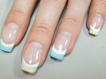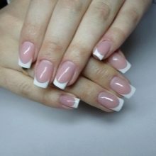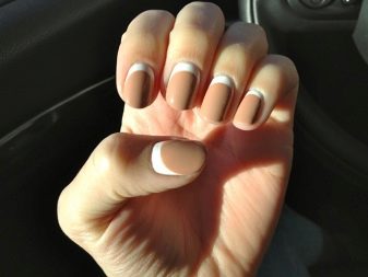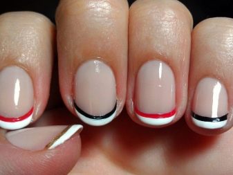 If French manicure is too boring, it can be varied. To do this, you need a nail polish with a thin brush. Apply a light color and allow it to dry. Then make a strip that runs along the edge of the entire nail.If the skin gets dirty, use a cotton swab previously moistened with nail polish remover.