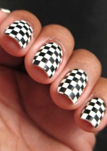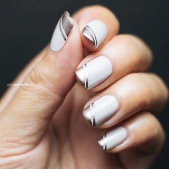 On a matte surface, it is better to make a small blot of metallic color. Strips of gold and silver look good. Adhesive tape, stickers, sliders and sparkles. With a short length, the strips can be black, then with their correct location, you can visually increase the length. For white, asymmetry and contrasting colors are ideal. It can be used as a sheet of paper, that is, apply the desired pattern and not be afraid that it will be lost in the background.