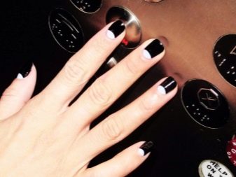 To create a moon manicure, you need two contrasting colors of varnish and a special sticker to form a crescent. Apply white as a base and allow it to dry completely. Stick the stencil and cover with a second contrasting varnish. Wait until dry, remove the paper and apply the last transparent layer.