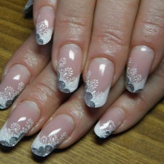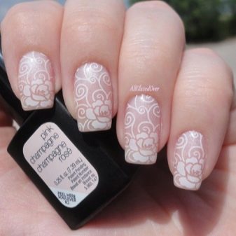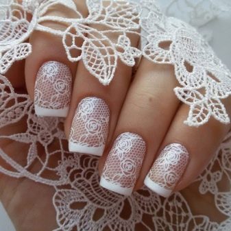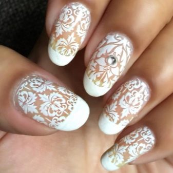 But that's not all, modern fashion offers girls stamping - it's a veil manicure on a white background. The technology is used in a simple and gel manicure. The nail is simply covered with a colorless base, then stamping is applied - a drop of white varnish is spread with a spatula over the nail plate. To achieve the effect of lace, you can take advantage of the tricks of the masters. To do this, you need to mix a drop of white in a transparent varnish and apply on top of an already made pattern.