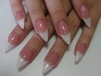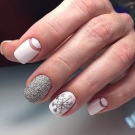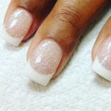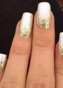 - Manicure french with sparkles. This method is used to decorate French manicure. To do this, a small number of sparkles are distributed along the smile line near the hole in the nail;