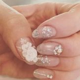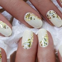 Glitter design is the best solution for wedding manicure. As a background, a traditional white or beige shade is used. Such a manicure will be a great addition to the elegant and sophisticated image of the bride.