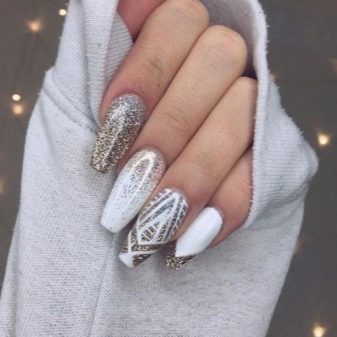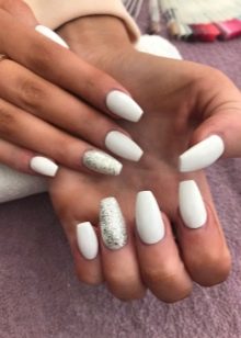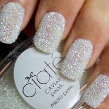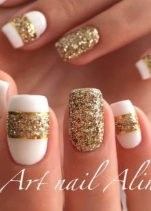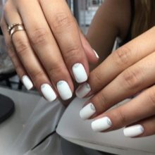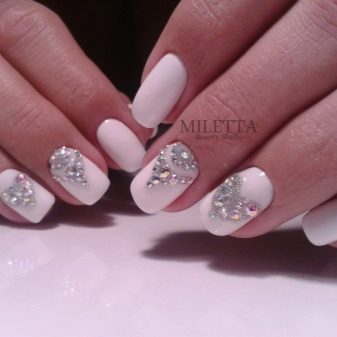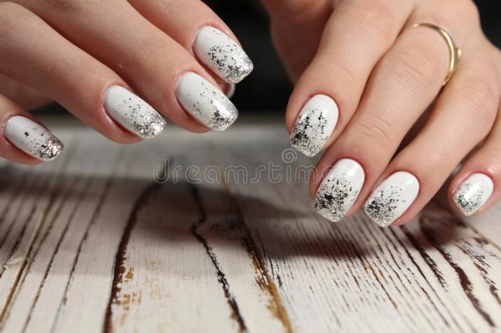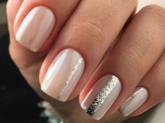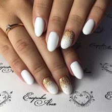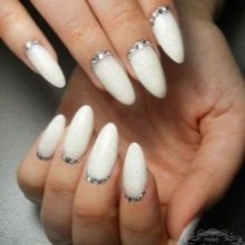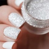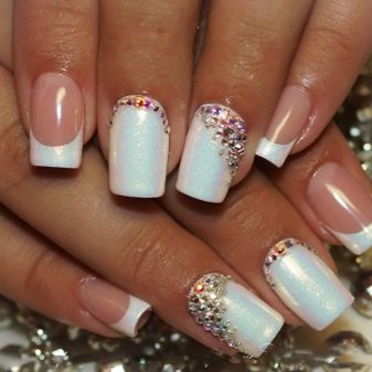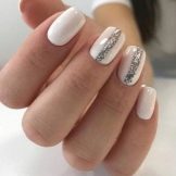 White manicure can be done with a monophonic coating. However, you can resort to improved options and create stunning manicure masterpieces using a variety of jewelry for nail design. One of the most spectacular techniques for decoration is the application of sparkles, which will make any manicure unusually beautiful and luxurious.