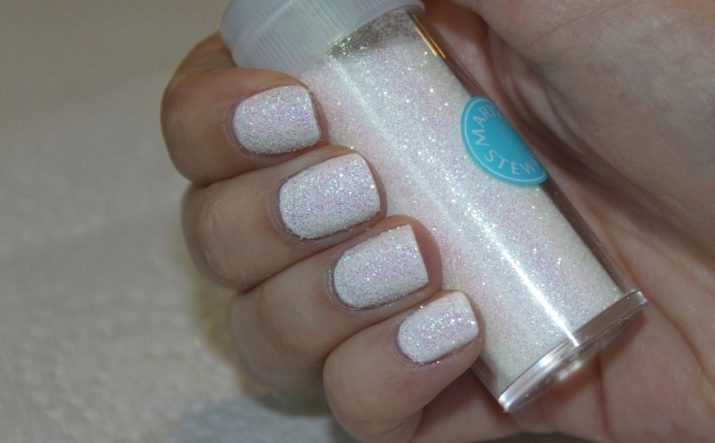 - Dry sparkles. They are available in special jars and have various forms, for example, in the form of hearts, stripes and stars. It is best to choose sparkles in the form of tiny balls, as they easily fit on a fresh layer of varnish. From above they must be fixed with a top coating or colorless varnish. Dry spangles come in two varieties: glitter and give. As for the first, this is a material that creates a strong radiance of nails due to the presence of large particles. Dust - these are relatively small particles that are more like pollen, so they are able to almost completely cover the nail plate, creating a continuous glow.