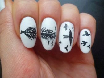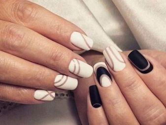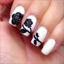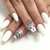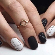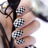 Black and white color combination is considered a classic. A chessboard, longitudinal and transverse stripes, hieroglyphs, ornaments, geometric figures, zigzag patterns are depicted on a white base of the nail. Often on a white background depict black little cats and dogs. To reproduce fine lines, veins and dots, use a thin brush or needle.