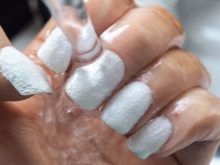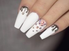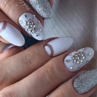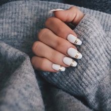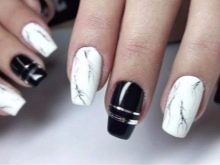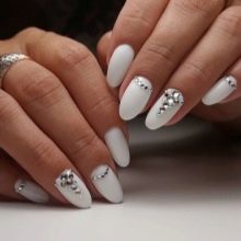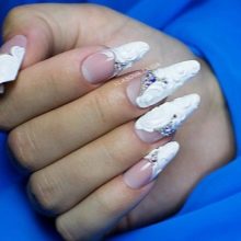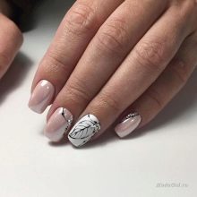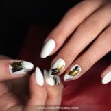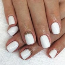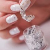 White design looks elegant with the application of shimmering powder, crystal chips, acrylic sand and other decorating elements. Craquels are created using a special white varnish with the effect of cracks in the paint layer. A gradient manicure caresses the look. Marble nails are also very popular. On a white background, a thin brush makes stains that imitate the texture of the stone.