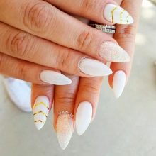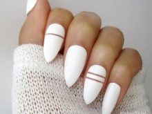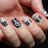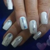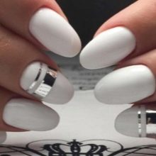Silvery and golden stripes that can be applied using a special metallized adhesive tape look unusual on white nails. Black stripes on a white nail surface make a strong impression on others. They can be located longitudinally and transversely. Stripes of a zebra look originally on the nail. Longitudinal lines are often laid with rhinestones.