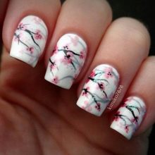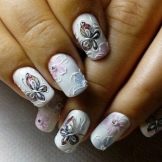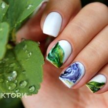 Any decorative element applied to the nail plate gives elegance and solemnity. Various patterns, flowers, symbols look great on a white background. This season it’s fashionable to use floral design. Gentle petals, branches, greens are drawn with a thin brush using a palette for mixing paints.