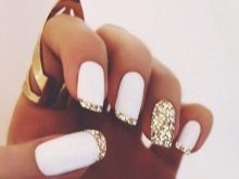 An attractive combination of a white nail base with a golden tone. The lunar manicure with gold splashes on a white background, recognized as a classic version, has a lot of varieties. The basal hole is white in color, and the nail plate is a different color. The white surface may have a transparent or colored root well.