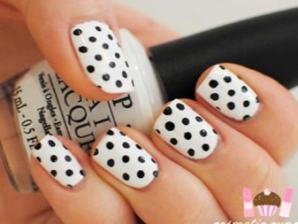 To create contrast it is very fashionable to combine a white tone with any dark color of a varnish. Black peas of different sizes on a white background are the latest fashion. All nails are covered in white, and two in black or red. An unusually bold combination with red colors looks enchanting and slightly bold.