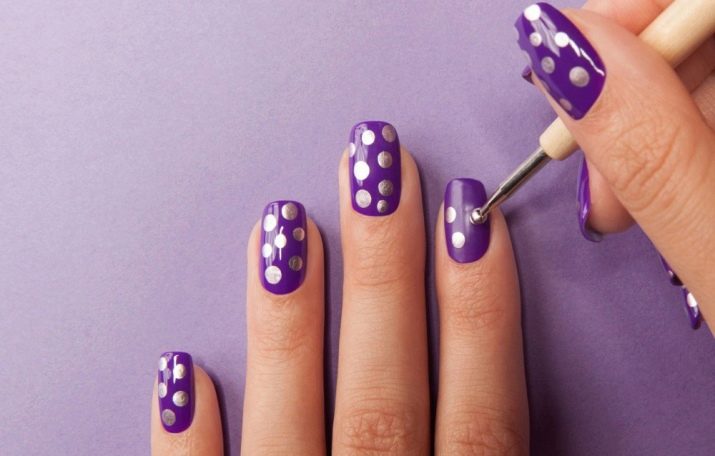 A bright background of purple gamut and contrasting silver peas - it looks very stylish, catchy, non-trivial. It is a great option for youth manicure.