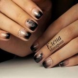 Decorate with images also manicure in the technique of "gradient". In order not to deprive the coating of a pleasant overflow of shades, the drawing is selected small, drawing it more often with one color. To highlight any elements of the picture, use small rhinestones of the desired color. For example, for white flowers they are transparent, for a lace pattern in black tones can be not only white, but also black. On stylized branches, the color of the rhinestone is often chosen to match the material used for drawing.