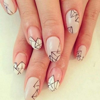 In addition, geometric ornaments are popular. For example, it can be white zigzag stripes on a beige background, vertical lines in the center of the nail plates with the image of points of different sizes on them.
