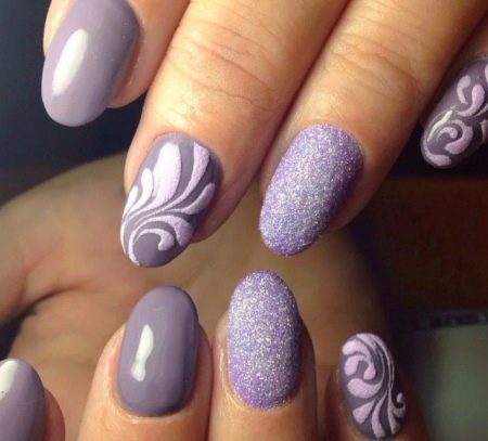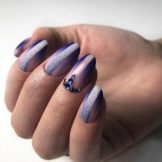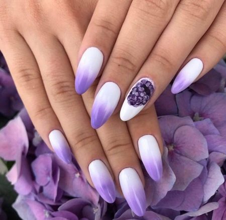 The ombre effect or the transition from one shade to another is created using several colors of coatings. The transition of related tones of purple color looks beautiful, allowing you to reveal its depth and versatility. No less harmonious is the combination of purple with pink or white.