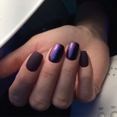 A special powder to give an ultra-extraordinary effect allows you to make the purple base cosmically stylish and unique. At the same time, it will look different in different shades. At its core, rubbing is a special powder with coloring pigment. To date, it has in its assortment a lot of different options that differ in effects. You can choose quite complex effects or imitation mother of pearl, pearls. Of course, the most premium categories will differ in price, but this is unlikely to stop fans of catchy designs.