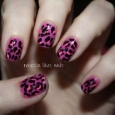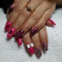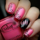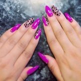 At first glance, it seems that the leopard print does not go well with bright pink. But try making a white base, and then draw dark C-shaped signs. You just have to fill the picture with any shade of fuchsia and other colors of light tones. It is effective to make a leopard print on only a few nails, and cover the rest on the entire surface with saturated pink fuchsia. A fuchsia-colored leopard print in a manicure is unlimited scope for your imagination.