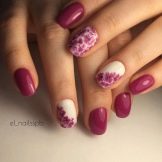 Many people like the version of the drawing, when bright fuchsia flowers are painted on white-varnished nails, and their edges are framed in black. In black, stems and leaves are depicted. Abstract compositions also take place with bright pink manicure. It all depends on your imagination and desire to make your image more harmonious.