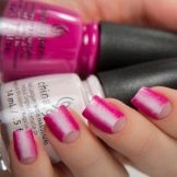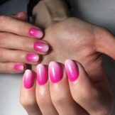 As you know, ombre is the use of two different shades to get the natural border of the transition from dark to light, and vice versa. On fuchsia nails, an ombre with a transition of pink to white can be recommended. Such a manicure will be less bright, but it will perfectly reveal all the facets of pink and white. The transition of fuchsia itself in different shades looks stylish: from light from the hole in the hole to dark to the edge. Such a delicate aesthetics of your manicure will not go unnoticed by others.