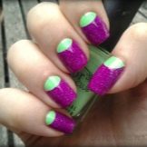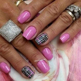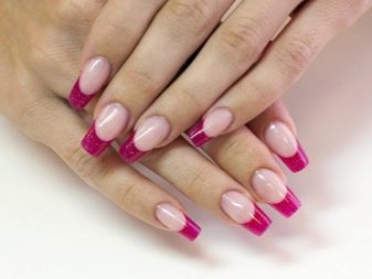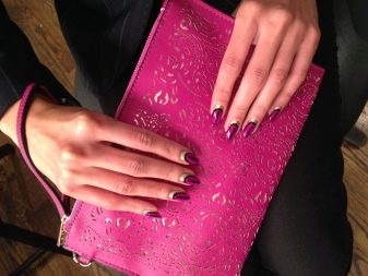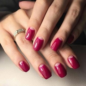 French (French manicure) is considered the standard of elegance, but modern fashion is characterized by a non-standard nail design using this classic technique.So, for a manicure of fuchsia color, a neutral, but bright white color on the ends of the nails is suitable. For a more spectacular look, make a jacket on only two nails, which are not located next to each other. The remaining nails are completely covered with pink varnish. French looks very elegant in combination with things of the same color, for example, with a clutch.