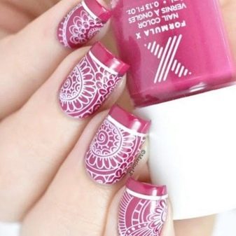 Before you figure out which pattern to apply to fuchsia nails, check out the section on color palette compatibility again. Only then can you give free rein to your imagination. Most often, ornaments and white flowers are painted on a bright pink background. But the drawings also look good yellow, orange and gold shades.