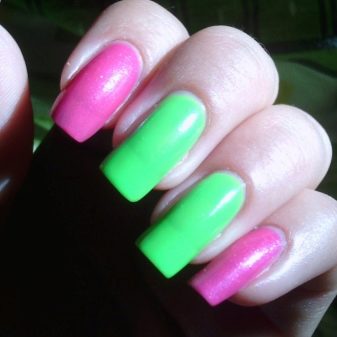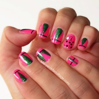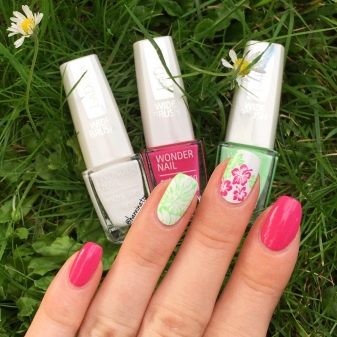 - With green. Light green shades emphasize the natural harmony of fuchsia shades. Any design of manicure with these colors will become more natural and natural. Floral ornament of green gamut is amazing on a pink background. Such a tandem is especially relevant in the warm season, when it is very harmoniously combined with the colors of nature.
