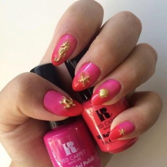 - With gold. A manicure where fuchsia appears in tandem with gold is a truly royal image. It will be effective to highlight only one nail with gold and shine, and cover the rest with a bright shade of fuchsia. Elegant gold patterns are also very attractive against the background of fuchsia nails. And do not forget to complete your brilliant image with gold jewelry.