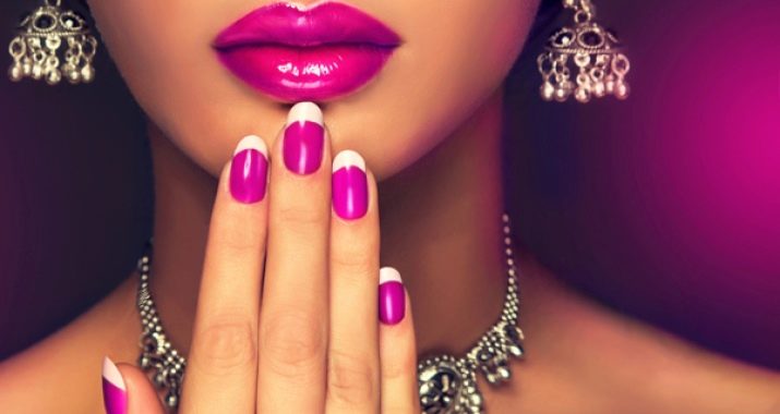 Here we see a variant of a successful combination of manicure, jewelry and makeup. The nail design is made using the French technique. The white ends look very elegant. Bright lipstick enhances the saturated color of fuchsia. Graceful silver jewelry adds an image of completeness and luxurious sparkle.