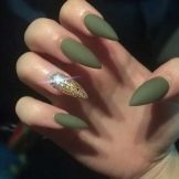 Correlating the fashionable color with the “nail” trends, it can be noted with confidence that three types of nails are the ideal form for a manicure of the khaki shade: oval (universal type), slightly straightforward and almond-shaped. As for the length, today it tends to moderation, as, however, the design of the manicure itself. In this case, color solutions will be built on the principle of length: the shorter the nails, the darker the contrast. This is due to the fact that long lengths and dark colors are more difficult to perceive, and it’s unacceptable to look vulgar for a modern woman.
