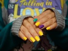 As practice has shown, colors that are difficult to imagine together in a single image, ideally "get along" on the nails. Modern fashion allows you to experiment, it is multifaceted and original, so experts in the field of nail aesthetics do not prohibit the use of two varnishes and more different tones on the nails. Moreover, the use of different colors on each finger is allowed.