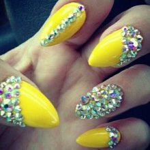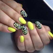 Most often, a bright manicure acts as a self-sufficient coating, however, it is often supplemented with rhinestones and various patterns: flowers, geometric shapes, animals, abstractions. Such auxiliary elements serve as a highlight of “nail art”, which will distinguish from the crowd and make others stop their eyes.