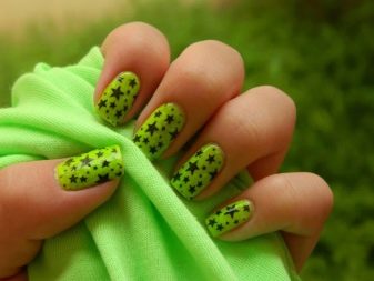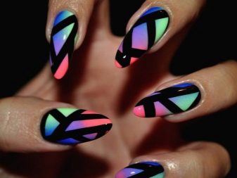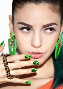 The cosmetic procedure using bright varnishes does not have any limitations. This, in fact, is the imagination and vision of the future composition by the master. And although acidic “nail art” is interesting and original in itself, additional decorations will also be useful for it. Creativity to the image will bring not only catchy colors on the nails, but also the decor of the coating. You can “dress up” the finished manicure with sparkles and rhinestones, cosmetic sand, lace and, of course, different designs.