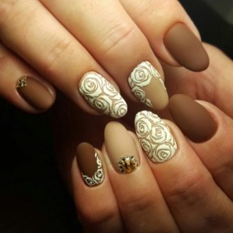 Manicure with coffee flowers. The basis for this variety is a matte or glossy finish. The drawing can be located both on one finger, and be distributed on 2 or even 3, and this will already be a wonderful full-fledged picture. Both of these options look great on female fingers and nails of any length and shape.
