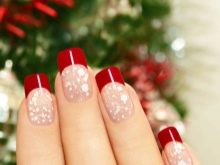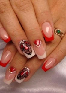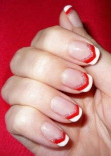 - Chic and shine. If the traditional jacket in red and white tones seems too everyday way to design nails, then it is worth adding additional elements - rhinestones, beads or crystals. Following the line on the tip of the nail, it will be appropriate to build a line of rhinestones, thereby further emphasizing it. You can also create a mirror image by placing crystals at the base of the nail. Using sparkles, you can create drawings or outlines of figures in the middle of the nail plate.