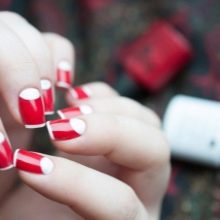 - Full staining. If you adhere to this method, then as a final result, you can get a nail completely filled with a color coating.There are two ways to do this: cover the main area of the nail plate with white varnish, and make the tip red, or, conversely, the tip is painted white, and the rest of the nail is red.