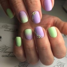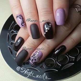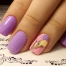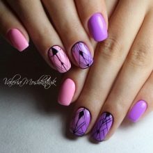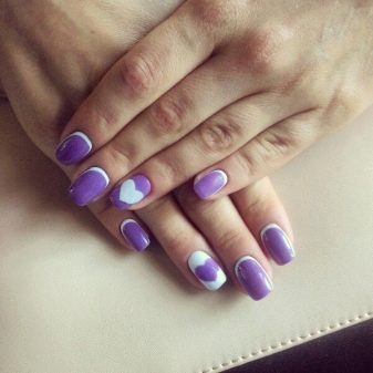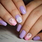 The times when women applied one tone of varnish to all nails are long gone. It is now in fashion to use several colors that are compatible with each other. The purple color in manicure can and should be combined both with calm pastel colors, and with such bright and saturated as the purple itself. Among the classic and always relevant combinations, one can note the tandem of lilac with pink, beige, black, white color of varnish. In a summer combination of yellow and lilac (dark or light), green mint with violet will look bright and bold.