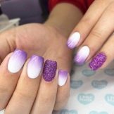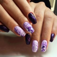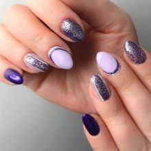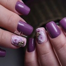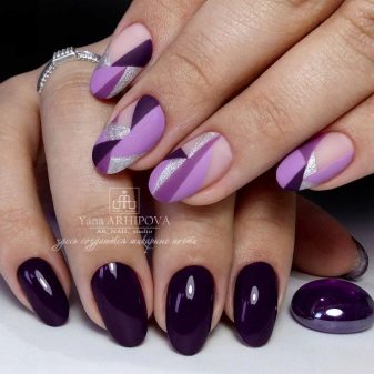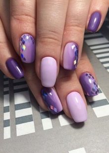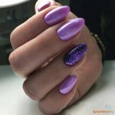 Unusual, festive and precious will be a manicure in which amethyst and turquoise tones, purple and emerald, plum with gold or silver are adjacent. Recently, a very fashionable gradient manicure design (with a smooth transition from one tone to another) can be created by combining lilac with light pink, raspberry, purple. But if you do not want to experiment with different colors, you can choose a certain tone of purple, and as a highlight use its matte, metallized, powdery or glossy version on one hand.
