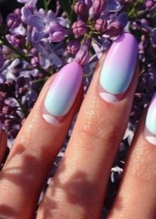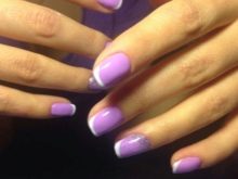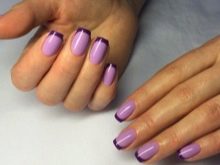 - French style lilac Suitable for every day or for the office. The edges of the nails can be decorated with a square "smile" or oval. Stick the stencil or tape of the desired shape on the fingernail painted with the main coating (amethyst, light beige, pink), and after drying paint the edges on the stencil (black, blue or white or dark purple). The “inverted jacket” will also look original, when a “smile” at the base of the nail is painted with a contrasting color using a stencil.