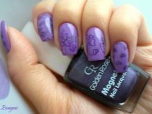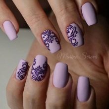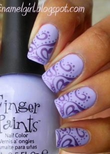 - Stamping manicure help create any desired pattern or pattern on one or more nails. On painted nails with a base coat of dark or light purple tones, you need to print a special manicure stamp with a pattern or pattern. A stamp is applied in a contrasting tone varnish from the base varnish, gold or silver patterns against a purple background will look great.