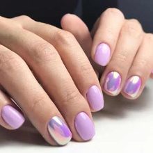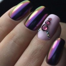 - Rub for manicure. An unusual mirror effect is created by the so-called rub for manicure, which can be created in purple design. It is not difficult to purchase a rub in modern beauty stores, and you can apply this miracle powder yourself at home.The main thing is to choose a base, in our case it is violet or lilac gel polish, as well as rubbing the desired grinding and finishing coating-top (matte or glossy if desired).