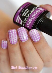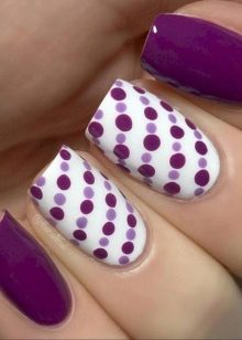 - Using dots - a nail tool that helps to create drops of different diameters, ornate lines, petals and flowers, you can come up with a lot of options for purple manicure. In this technique, it is customary to apply the base color on the entire surface of the nails, and then decorate the droplets and lines with varnish of a different tone. So, on a plum shade coating, droplets of golden or silver varnish will look great. In this case, the shape of the drops can vary from large to smaller or change their location: only on the edge of the nail or in the hole, in the form of a triangle. At home, dots can be replaced by an ordinary ballpoint pen, pencil, invisibility for hair.