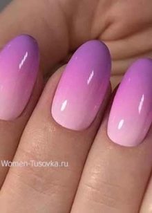 - Create Gradient Manicure with smooth transitions at home, you can do it yourself with a regular sponge. Stripes (falling on each other) of two or three tones of varnish, combining with each other, are simultaneously applied to it. From the sponge, the pattern is imprinted on the nails, while in order to avoid fingerprints on the skin, stick the skin around the fingers with adhesive tape.