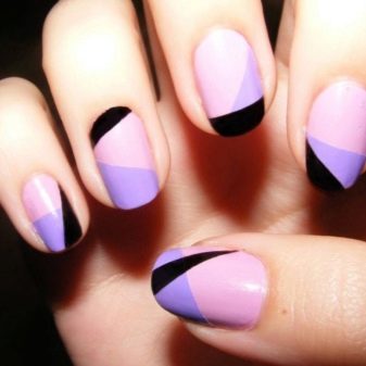 - For lovers of clear lines in manicure, you need tape to implement a geometric pattern on the nails. Adhesive tape can be glued on the nails in different ways: divide the nail in half diagonally, across, in the form of triangular edges and even a square in the center. For maximum effect, you can use two or three contrasting shades. It can be lilac and white with mint green or yellow, turquoise and eggplant, black and violet, etc.