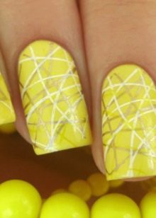 Since this is a summer manicure, the main theme of the drawings are fruits. Given the name of the color, nails are often decorated with lemon slices. To make the pattern stand out, it is necessary to use a varnish that is brighter than the background coating. To dilute the yellow gamut, add shades of green, using them to draw foliage. You can draw slices using special stencils and special brushes, but it is better to use the services of experienced craftsmen.