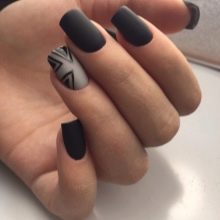- Matte manicure in gray-black tones looks pretty strict, but unusual. The image is complemented by interesting geometric patterns that will not allow the manicure to be too elaborate. From such a design it blows nobility, elegance and grace. Perfect for work and serious events. It does not look festive, but it will look decent with a small black dress or a beautiful evening outfit.