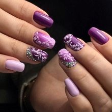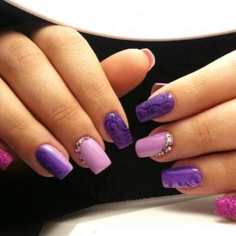 - Manicure with rhinestones. It is a universal solution, rhinestones can be laid out both in the form of geometric shapes and in holes. It is advisable that the flickering elements are matched to match the purple color. In addition, this design also provides for the use of textured prints. Recently, chaotic lines and vertical stripes have been in fashion.