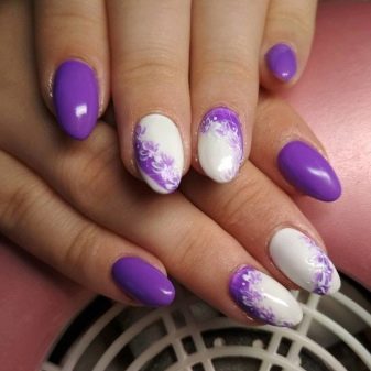 Creating a manicure in purple, you can use the basic foundation, made in beige, gray, black and white. With the above colors of the palette, the mysterious color goes well, and the nails decorated with such a contrast look chic. If the girl wants to translate a brighter manicure style into reality, then you can experiment and apply the following combinations: