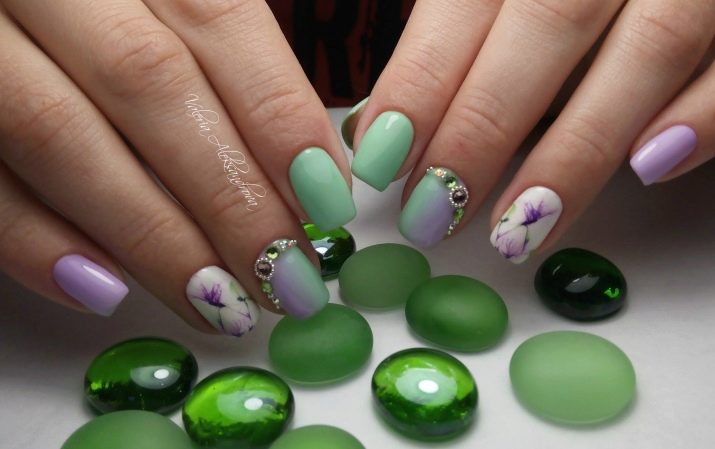 To stand out with extravagant manicure, experts also recommend combining a dark purple tone with emerald and turquoise colors. In addition, purple and raspberry can become auxiliary shades in this case.