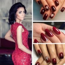 If time is short, you can paint your nails with shades of red. Simple and tasteful. At the same time, choosing a coating color to match the dress is considered bad form. Well, if the manicure is at least a couple of shades darker. Marsala, burgundy, coral, all wine shades will perfectly support the majority of red dresses. The choice of both glossy and matte finish will be successful.