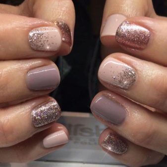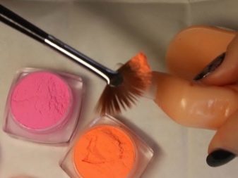 - Choose the color of gel polish, paint and dry your nails, except for the last layer, which must be left moist. Sprinkle acrylic abundantly on it, the excess is brushed off by tapping the nail on the table. Then you need to dry your nails under the lamp.
